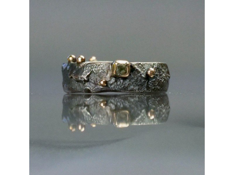Sidabro ir aukso žiedas RADHARANI, puoštas nešlifuotu deimantu.
