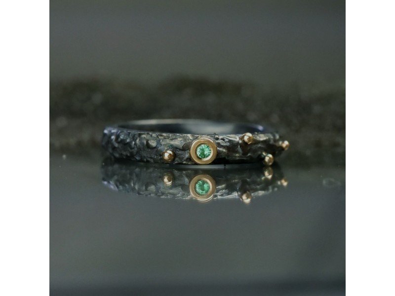 Sidabro ir aukso žiedas ŽEMYNA, puoštas smaragdu.